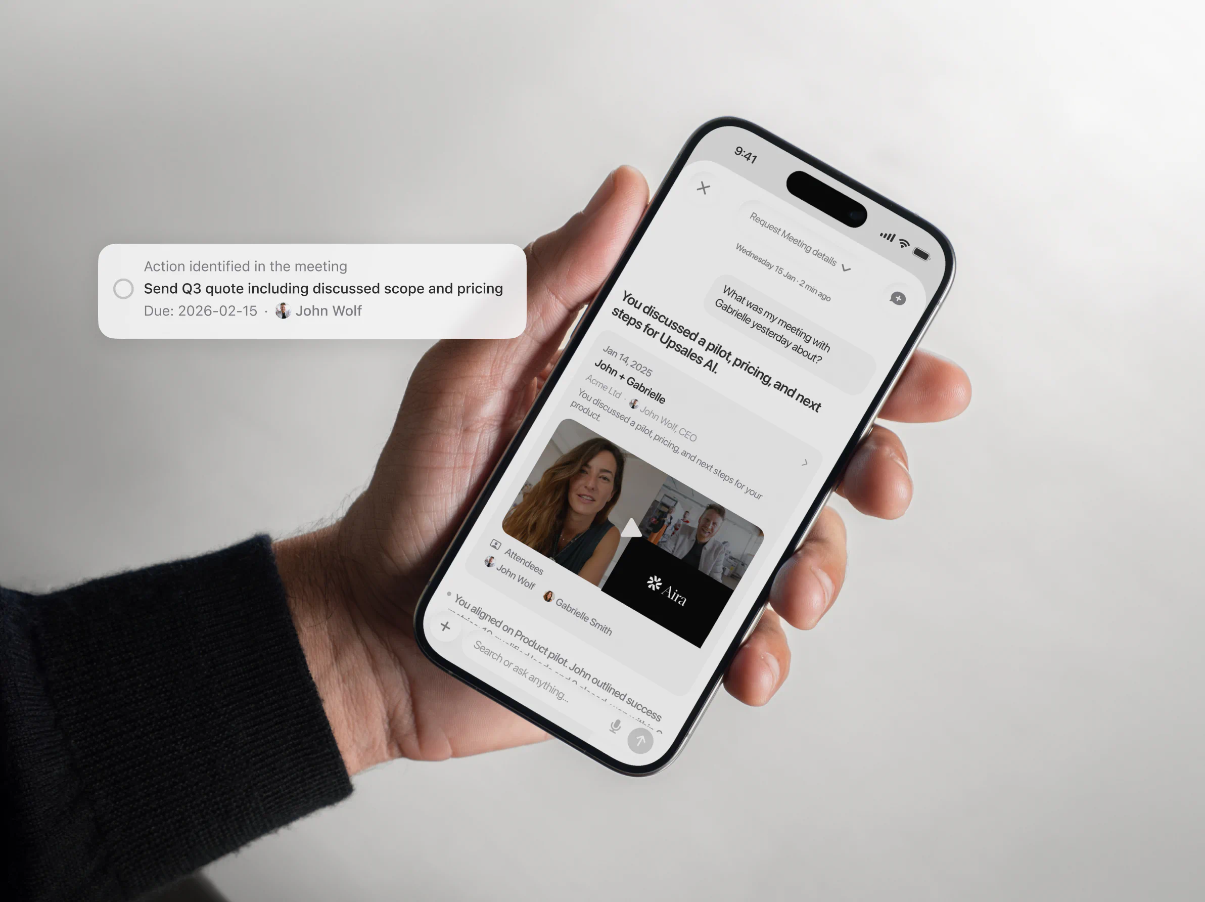Aira joins every meeting, records the conversation, and takes notes for you. Every decision, promise, and next step is captured and logged to the right customer.